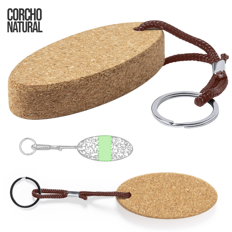 Llavero flotante de línea nature, fabricado en en corcho natural, fomentando la utilización de materiales naturales y así ayudar a la sostenibilidad del planeta. Con cordón de poliéster y anilla metálica.
