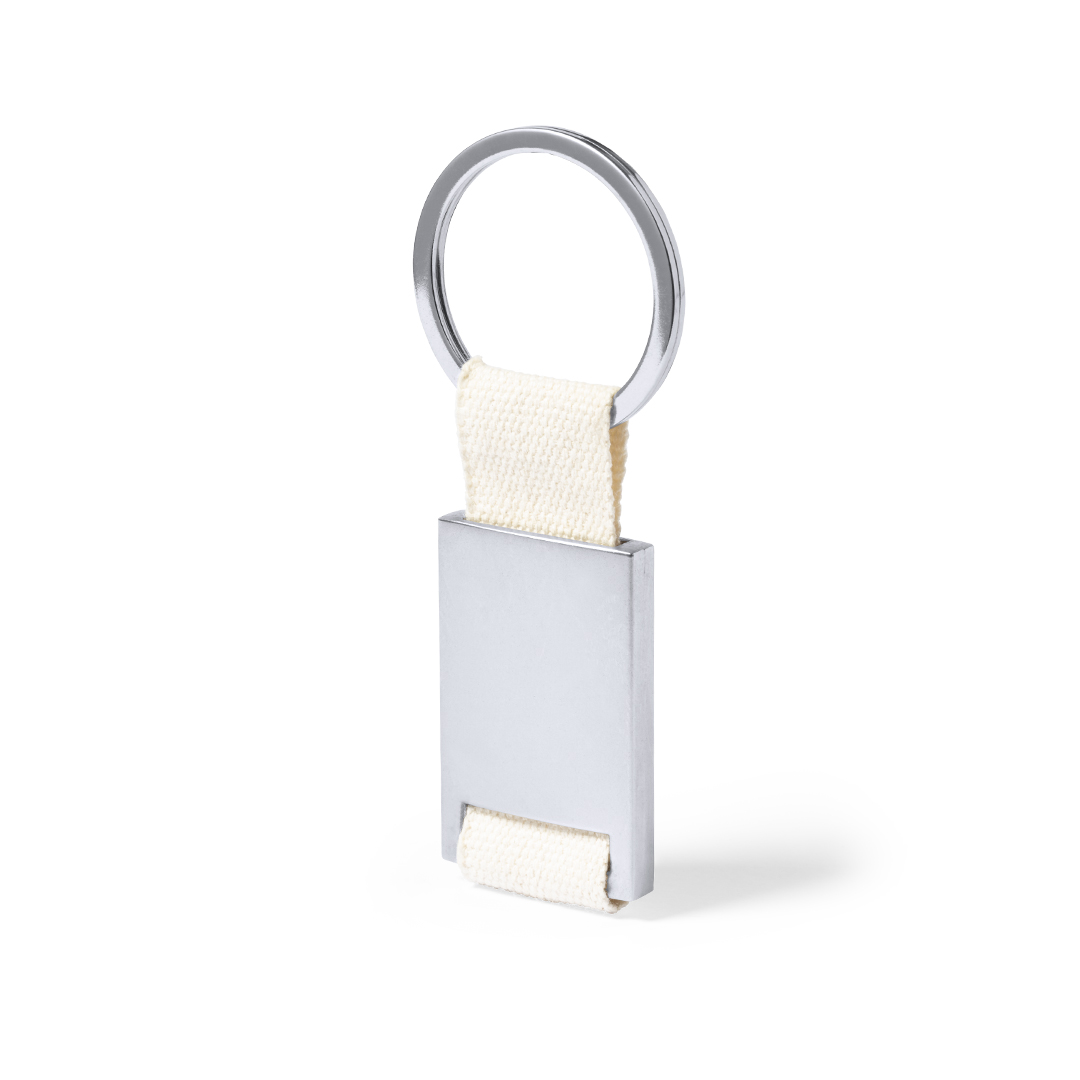 Llavero con cuerpo metálico de acabado plateado. Cinta 100% algodón de acabado natural. Amplia superficie de marcaje y anilla llavero metálica a juego. Presentado en bolsa individual con cartón interior kraft.