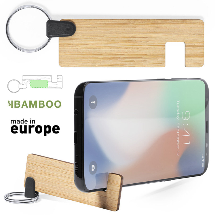 Llavero soporte para smartphone y tablet de línea nature, hecho en bambú procedente de cortes naturales. De fabricación europea.