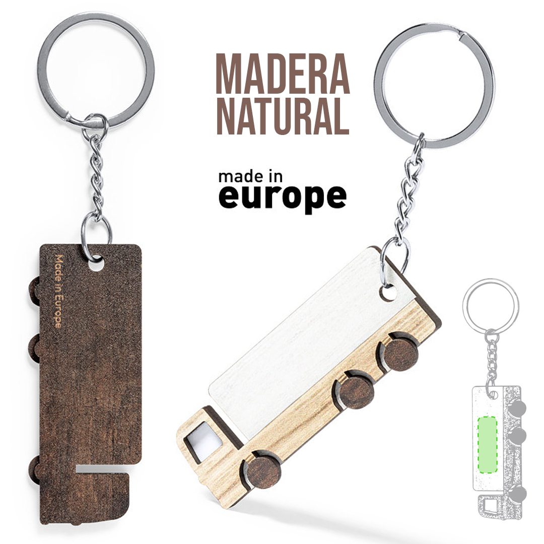 Llavero con diseño camión, fabricado en madera natural y de original acabado bicolor. Amplia superficie de marcaje, con anilla y cadena metálicas y distintivo Made In Europe.