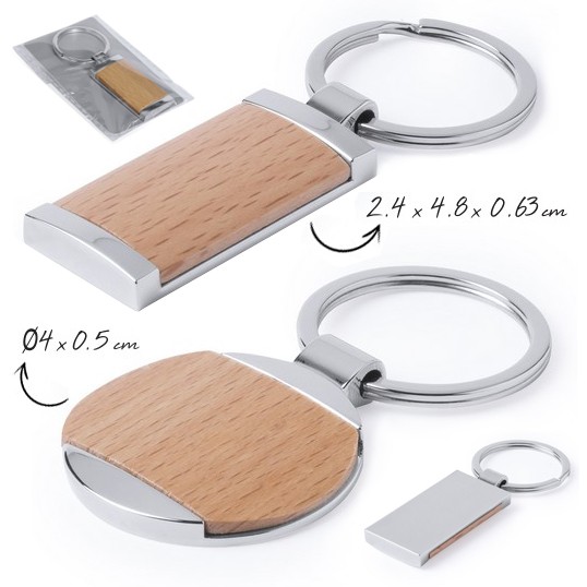 Llavero en combinación de materiales metal de acabado brillante y madera natural. Con amplia superficie para marcaje y presentado en bolsita con refuerzo de cartón en color plateado. Disponible en diseños circular y rectangular.