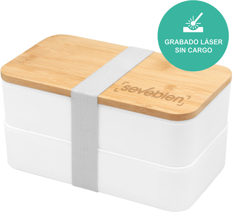 18.5 x 10.5 x 9.7 cm. Bambú + PP. Contenedor de alimentos con tapa de Bambú. Posee dos compartimentos plásticos, un separador y bandeja porta set de 3 cubiertos (cuchillo, tenedor, cuchara). La tapa de bambú debe presionar firmemente la bandeja donde se fija el juego de cubiertos. Cierre con sujeción elástica color gris. Producto apto para microondas (sin la tapa). Importante: solo se puede calentar la comida, NO sirve para cocinarla.