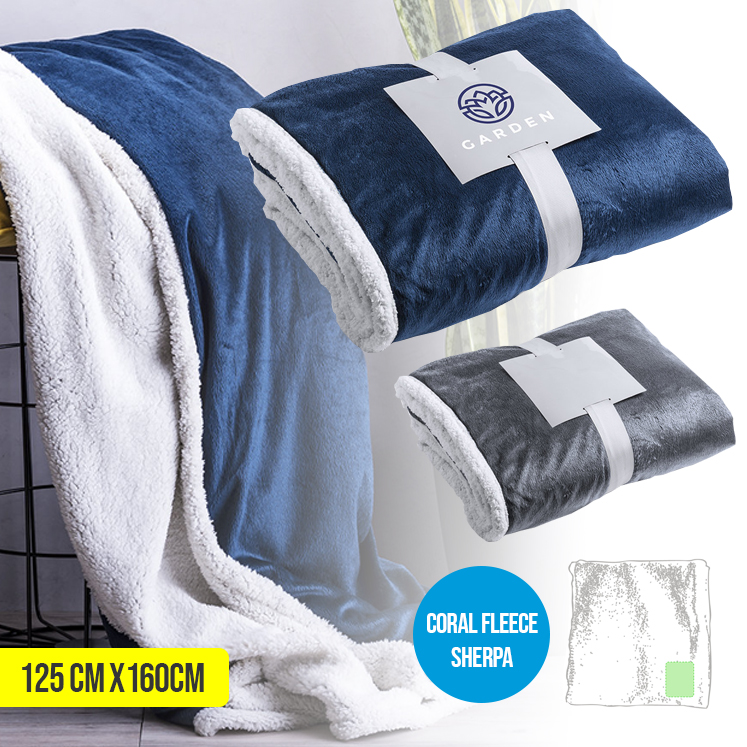 Manta en elegante diseño bicolor de 125x160cm. En suave y cálida combinación de materiales coral fleece y sherpa de 380g/m2. Presentada en cinta con lámina para fácil impresión. *Para pedidos con impresión, se debe incrementar el coste del marcaje + 0,20 / unidad en concepto manipulación especial*