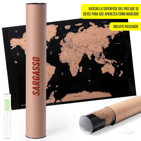 Mapamundi de línea nature para los más viajeros. Fabricado en papel laminado, basta con rascar la superficie del país que se desee para que aparezca como marcado. Incluye rascador y viene presentado en un atractivo estuche de cartón de diseño eco. Rascador Incluido