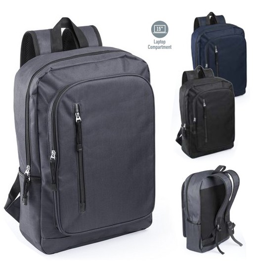 Resistente mochila de poliéster 600D con cierre de cremallera y bolsillos frontales. En sobrios colores, con espalda y cintas de hombros acolchadas, compartimento acolchado interior para portátil de hasta 15 pulgadas y cintas en tiradores para fácil apertura. Bolsillo Acolchado para Portátil. Parte Trasera y Cintas Acolchadas