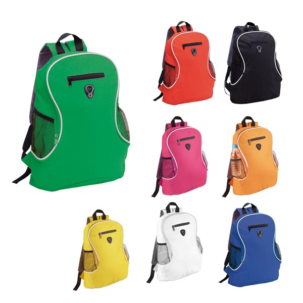 Mochila de poliéster 600D. Fabricada en divertidos y variados colores con amplia apertura de su bolsa principal y práctico bolsillo en la parte central. Cuenta con dos bolsillos elásticos de redecilla a los lados y una salida de auriculares en la parte frontal. Accesorios en color negro, con cintas de hombros cómodas, acolchadas y ajustables. Cintas Acolchadas