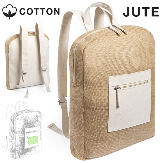 Mochila multiusos de línea nature y diseño bicolor. Fabricada en yute, con detalles en algodón. Compartimento principal con cierre de cremallera y doble tirador, con bolsillo frontal de cierre de cremallera para fácil marcaje y cintas ajustables a juego.