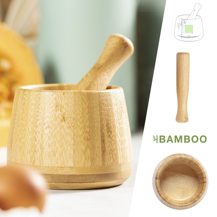 Mortero de línea nature. Fabricado en bambú, para así fomentar el uso de materias primas naturales. Con macerador incluido y presentado en caja individual de diseño eco.