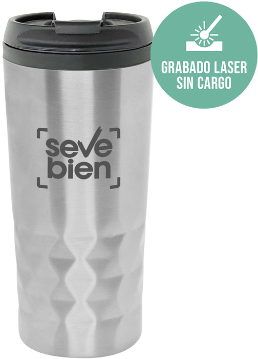 Ø 6,5 x 16 cm. Capacidad 300 ml. Acero inoxidable y plástico. Mug doble pared. Exterior metálico con detalles en relieve, interior plástico. Tapa plástica a rosca. Base antideslizante. Presentación en caja de regalo.