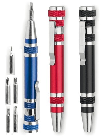 Multiherramienta de aluminio de 6 accesorios en variada gama de vivos colores metalizados. Con cuerpo anti deslizante y clip metálico. Incluye 6 cabezales destornilladores planos y de estrella. 6 Accesorios
