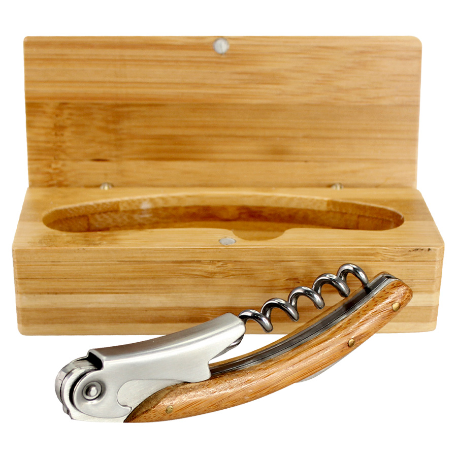 Multiherramientas para el vino, en caja sólida 100% madera Bamboo, con cierre mosquetón envejecido. Incluye descorchador, destapador y abre-sellos.