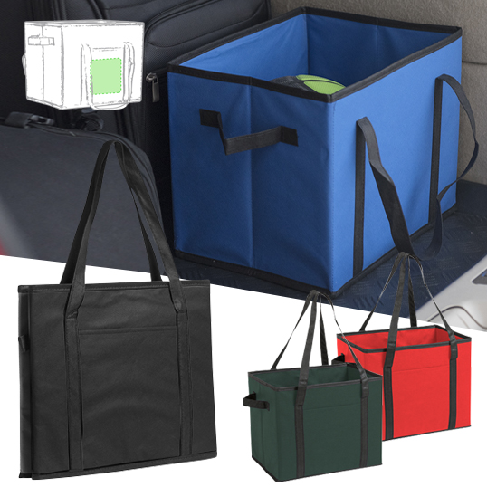 Organizador plegable para el maletero del coche en resistente non-woven de vivos colores. Con asas de transporte reforzadas, asa lateral, bolsillo frontal y base rígida para un firme ajuste.