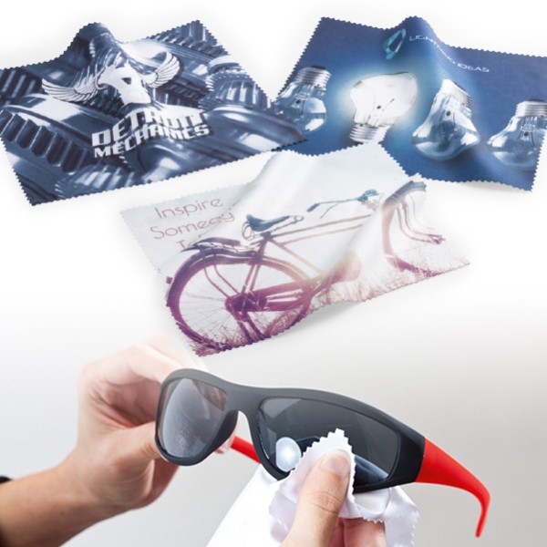 Paño limpiador en suave microfibra y diseñado para marcaje en sublimación. Laterales reforzados mediante corte de seguridad en zigzag.