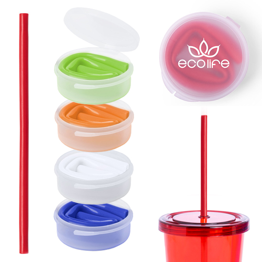 Pajita de silicona flexible y reutilizable, de 25,5cm de largo. Disponible en variada gama de colores brillantes y presentada en estuche de PP con acabado translúcido. Reutilizable