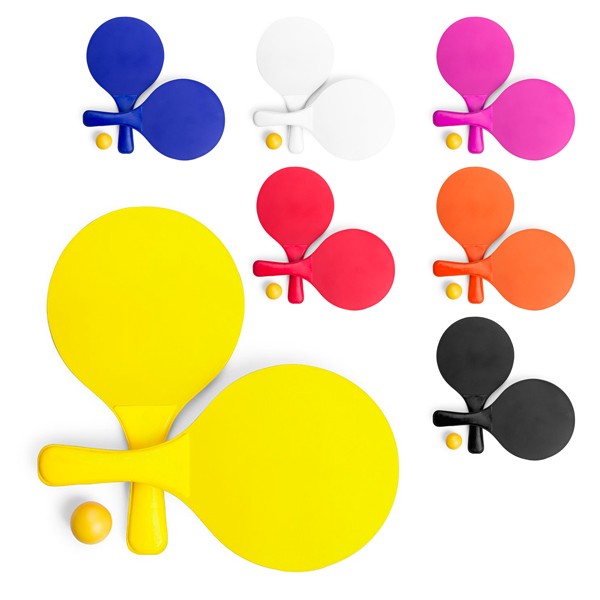Par de palas de playa de alta calidad en madera natural de variada gama en vivos colores. Con mango reforzado a juego y presentadas en bolsa redecilla con pelota.