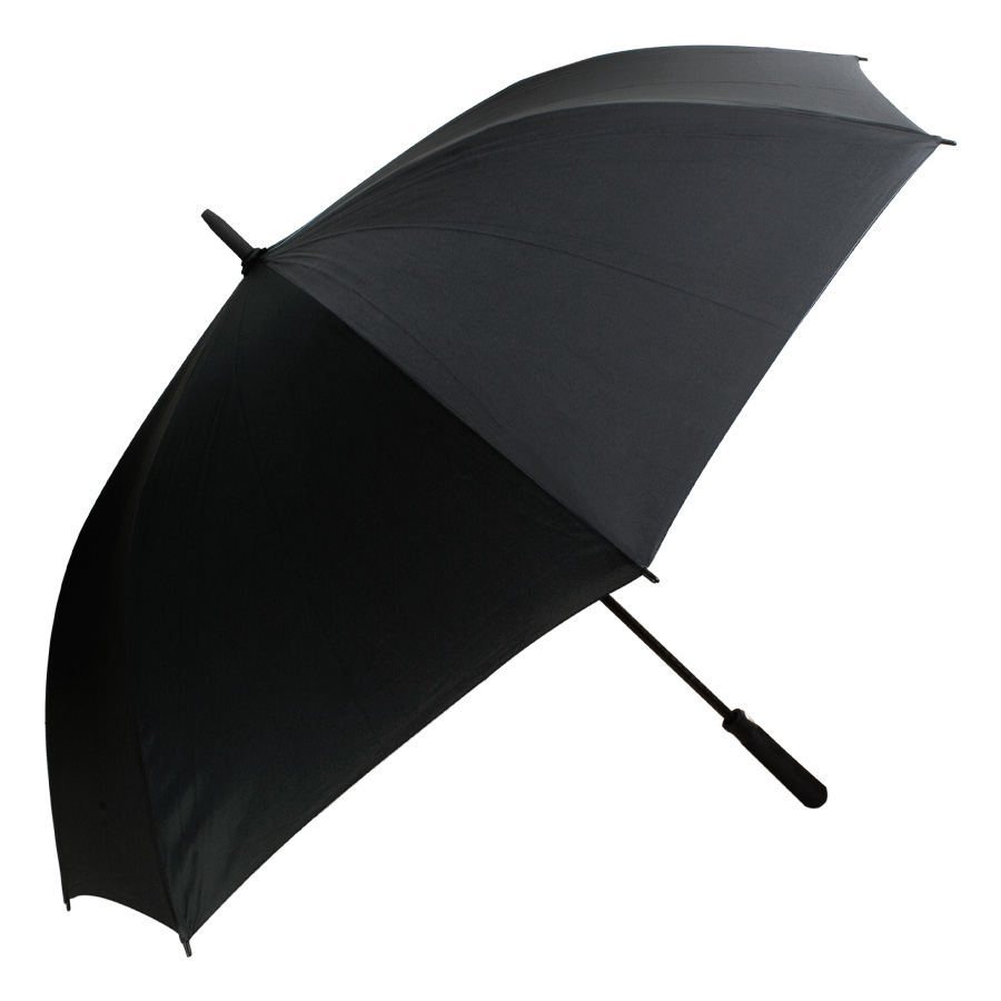 Paraguas ejecutivo gigante, con 8 cascos de tela 190T PONGEE, reverso UV. Contiene varas reforzadas Anti-Vuelco de Fibra de Vidrio color negro y sistema de apertura automático. Mango recto de EVA negro. Incluye funda al tono de 190T PONGEE.