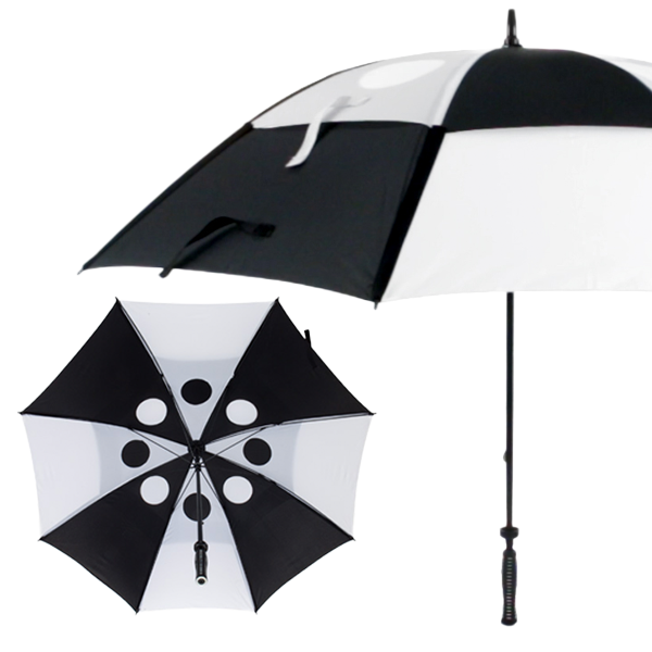 Paraguas de Golf de 8 paneles de sobrio diseño bicolor y 135cm de diámetro y de apertura manual. En resistente material pongee con sistema de seguridad antiviento. Con varillas de fibra en color negro, cierre doble de velcro y suave mango acolchado en espuma. Presentado en funda del mismo material en elegante color negro. 31"". Sistema Antiviento