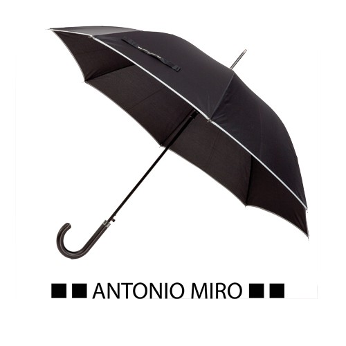 Paraguas de Antonio Miró de 8 paneles, con elegante diseño en color negro con ribetes en color blanco. De 100cm de diámetro, con apertura automática y en resistente material pongee. Con varillas metálicas en color negro, cierre de velcro y mango de suave tacto en polipiel. Presentado en funda con logotipo de la marca y cinta con accesorio de ajuste. 22"". Automático. Mango Polipiel. Funda Pongee
