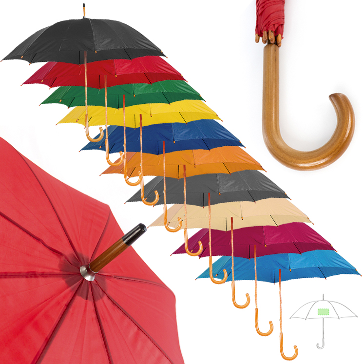 Paraguas de 8 paneles confeccionado en poliéster. De 105cm de diámetro, con apertura manual, varillas metálicas en color negro y cierre de velcro. Palo y mango fabricados en suave madera de color natural, con tela en variada gama de vivos colores. 23"". Mango y Caña Madera