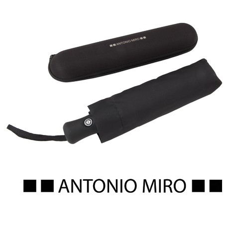Paraguas plegable de Antonio Miró, de 8 paneles y elegante diseño en color negro con ribetes en color blanco. De 95cm de diámetro, con mecanismo automático de apertura y cierre, sistema antiviento y en resistente material pongee. Con varillas metálicas en color negro, cierre de velcro y mango ergonómico con cinta de transporte. Presentado en funda individual a juego con logotipo de la marca. 21"". Apertura y Cierre Automáticos. Sistema Antiviento. Funda Poliéster