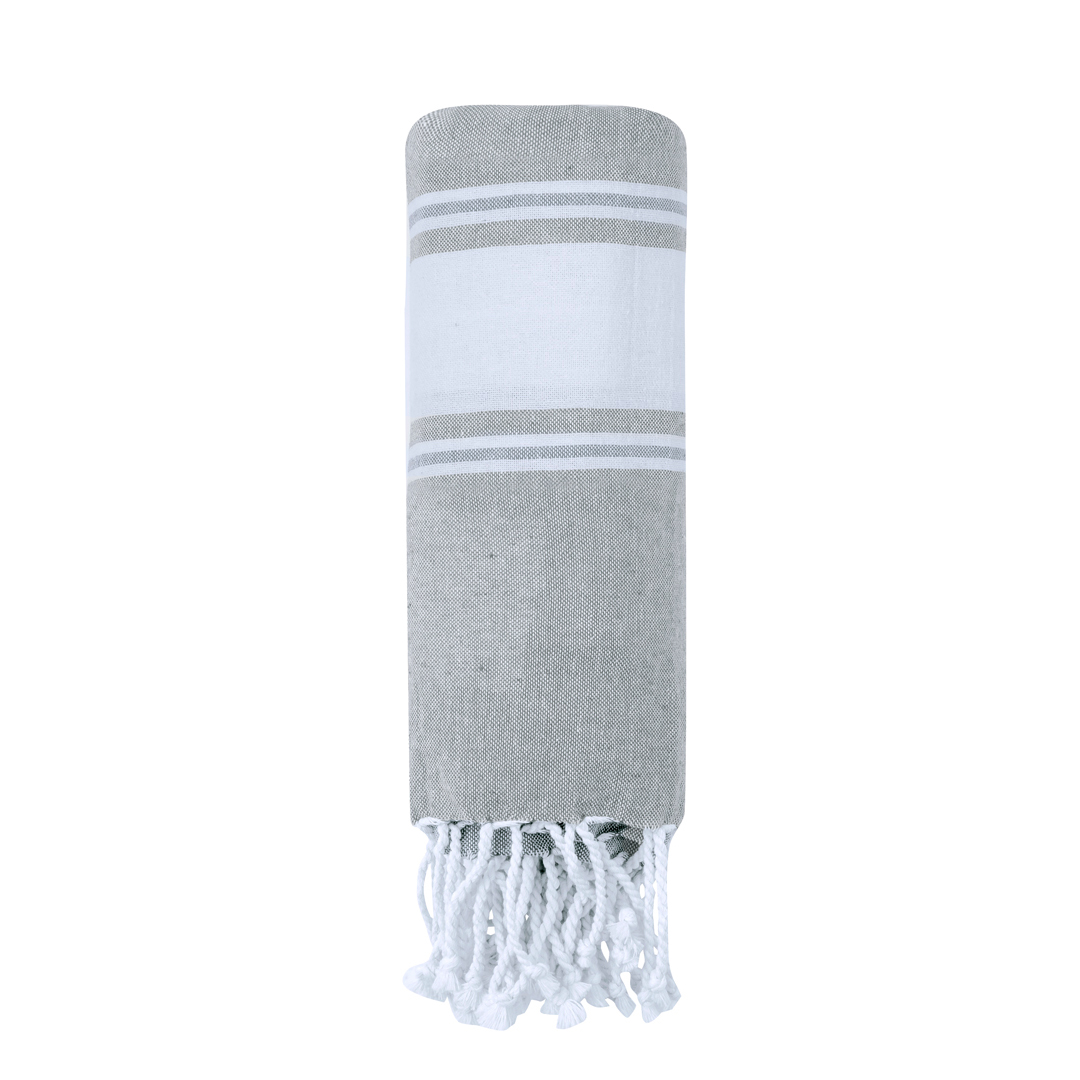 Suave pareo de toalla de 180g/m2 en combinación de algodón y poliéster. Disponible en variada gama de colores en tono bicolor. Presentado individualmente en bolsa.
