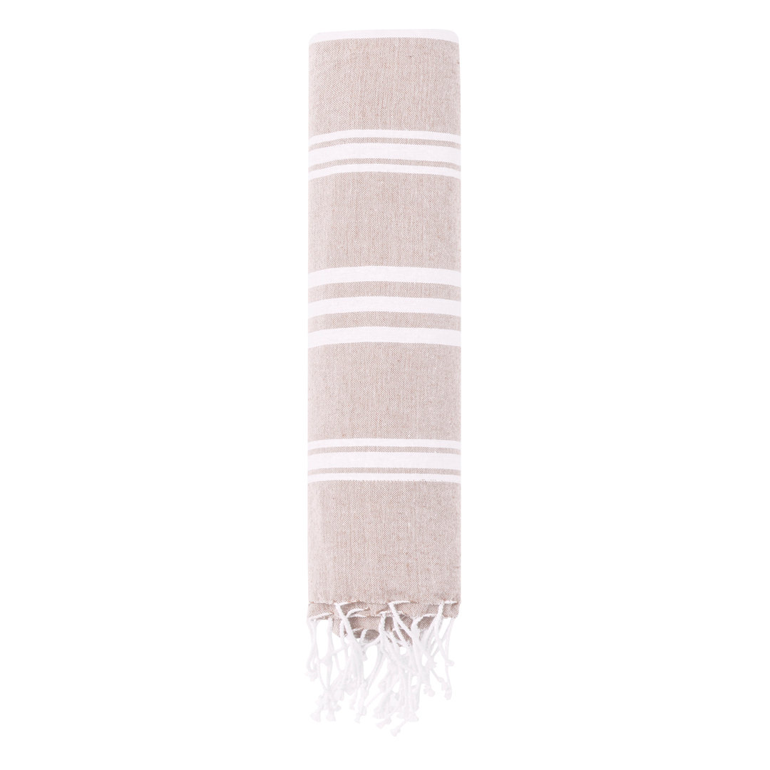 Suave pareo toalla en combinación de algodón reciclado de 130g/m2 en el frontal y poliéster de 125g/m2 en la parte trasera. Disponible en variada gama bicolor, con etiqueta lateral. Presentado en bolsa individual.