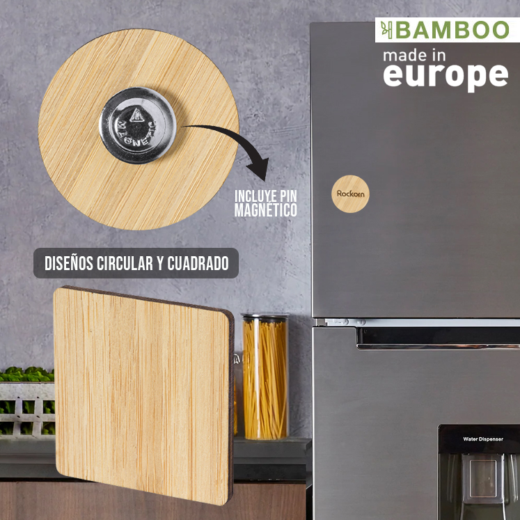 Pin de línea nature, hecho en bambú procedente de cortes naturales. De fabricación europea y disponible en diseños circular y cuadrado, con pin magnético. Magnético