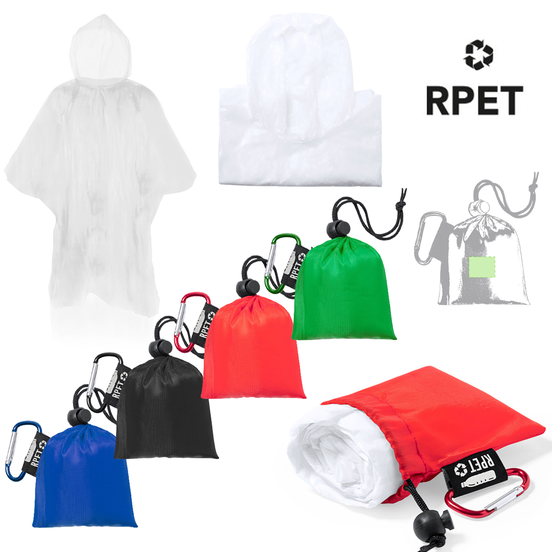 Poncho para adulto en material LDPE. En medidas 102x127cm y presentado en funda de poliéster RPET, elaborado a partir de plástico reciclado, para así fomentar la reutilización de residuos plásticos y ayudar a la sostenibilidad del planeta. Bolsa con mosquetón a juego para fácil transporte y cierre ajustable, disponible en variada gama de colores. Con distintivo RPET en etiqueta exterior. Talla Única. Adulto. 127 x 102 cm. Funda Poliéster RPET