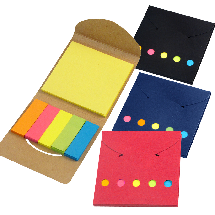 Porta Notas Adhesivas Ecológico de Cartón reciclado. Incluye 1 taco de notas adhesivas de 25 hojas de 7,5 x 7,5 cm + 5 tacos de 25 banderitas adhesivas de 5 x 1,5 cm.