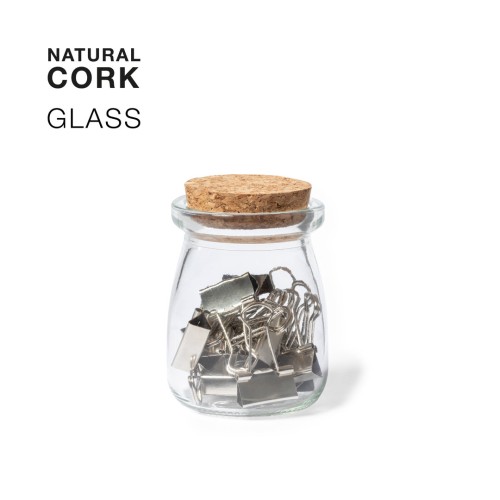 Portaclips fabricado en resistente cristal transparente, con original diseño vintage y tapón en corcho natural. Incluidos 15 clips metálicos, presentado en caja individual de cartón kraft. 15 Clips Incluidos
