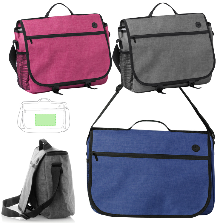 Portadocumentos con solapa de cierre clic ajustable en poliéster 600D, de diseño bicolor en vivos tonos. Con salida de auriculares, bolsillo de cremallera en solapa y bolsillo de redecilla lateral. Con asa reforzada, cinta bandolera ajustable y compartimentos interiores con fundas para bolígrafos y smartphone.