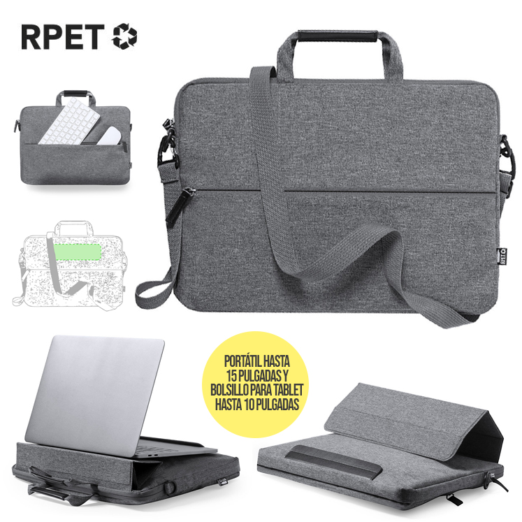 Portadocumentos de línea nature y en resistente 300D RPET efecto melange, elaborado a partir de plástico reciclado, para así fomentar la reutilización de residuos plásticos y contribuir a la sostenibilidad del planeta. Con original soporte integrado para ordenador portátil, bolsillos principal y frontal con cierre de cremallera. Interior con bolsillo acolchado para portátil de hasta 15 pulgadas y bolsillo para tablet de hasta 10 pulgadas. Cinta bandolera ajustable para hombro, con asa de transporte reforzada. Resistencia hasta 6kg, con distintivo RPET en etiqueta exterior. Acolchado. Bolsillo Acolchado para Portátil