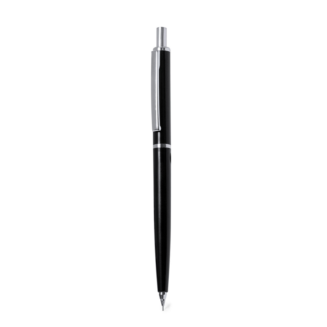 Elegante portaminas hecho en resistente ABS. Cuerpo en color negro y empuñadura a juego de tacto liso, con elementos cromados como botón, clip, punta y anilla central.Con goma y minas incluidas de 0,7 mm. Minas 0,7 mm Incluidas