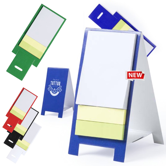 Original portanotas de cartón con diseño stand en variada gama de vivos colores. Incluye 30 notas adhesivas grandes y 50 mininas adhesivas. Presentación desplegado para fácil impresión. 30 Notas Adhesivas 4,5 x 6 cm. 50 Mininotas Adhesivas 1,2 x 4,5 cm