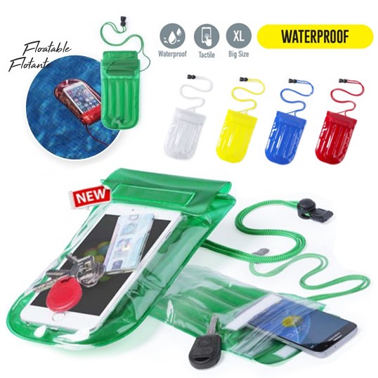 Práctico portatodo impermeable e inflable tamaño XL. En PVC con función táctil y doble sistema de seguridad para preservar la estanqueidad. Con zona de marcaje frontal a juego con el cordón de transporte -con accesorio de ajuste-. Impermeable. Pantalla Táctil
