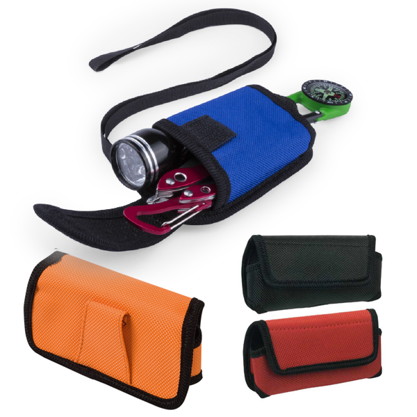 Portatodo en resistente poliéster y variados colores. Con solapa de cierre de velcro y cinta accesorio para cinturón en parte posterior.