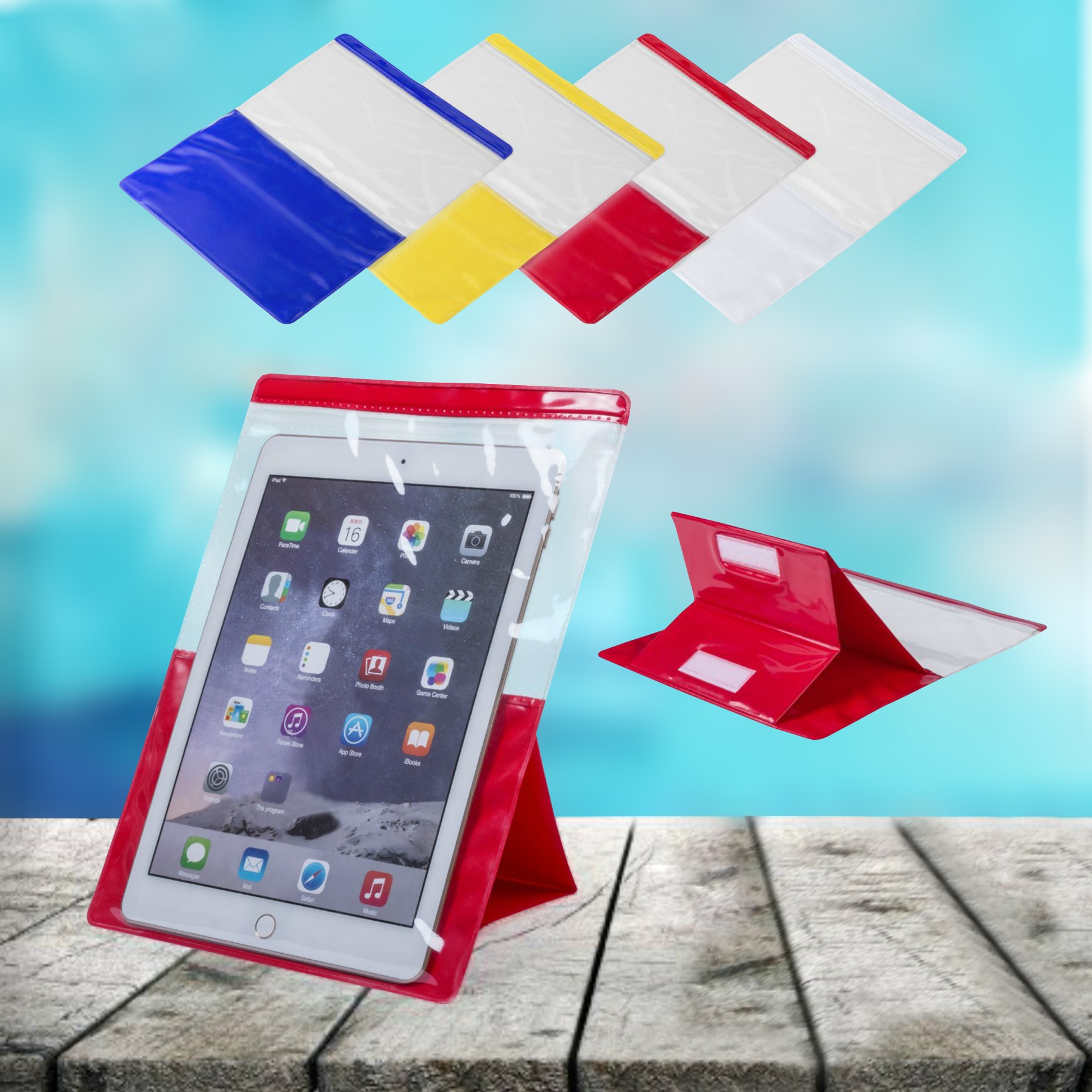 Práctico portatodo impermeable en PVC en atrevido diseño bicolor, con función táctil y soporte integrado. Diseñado especialmente para tablets de hasta 9,7 pulgadas. Impermeable. Pantalla Táctil