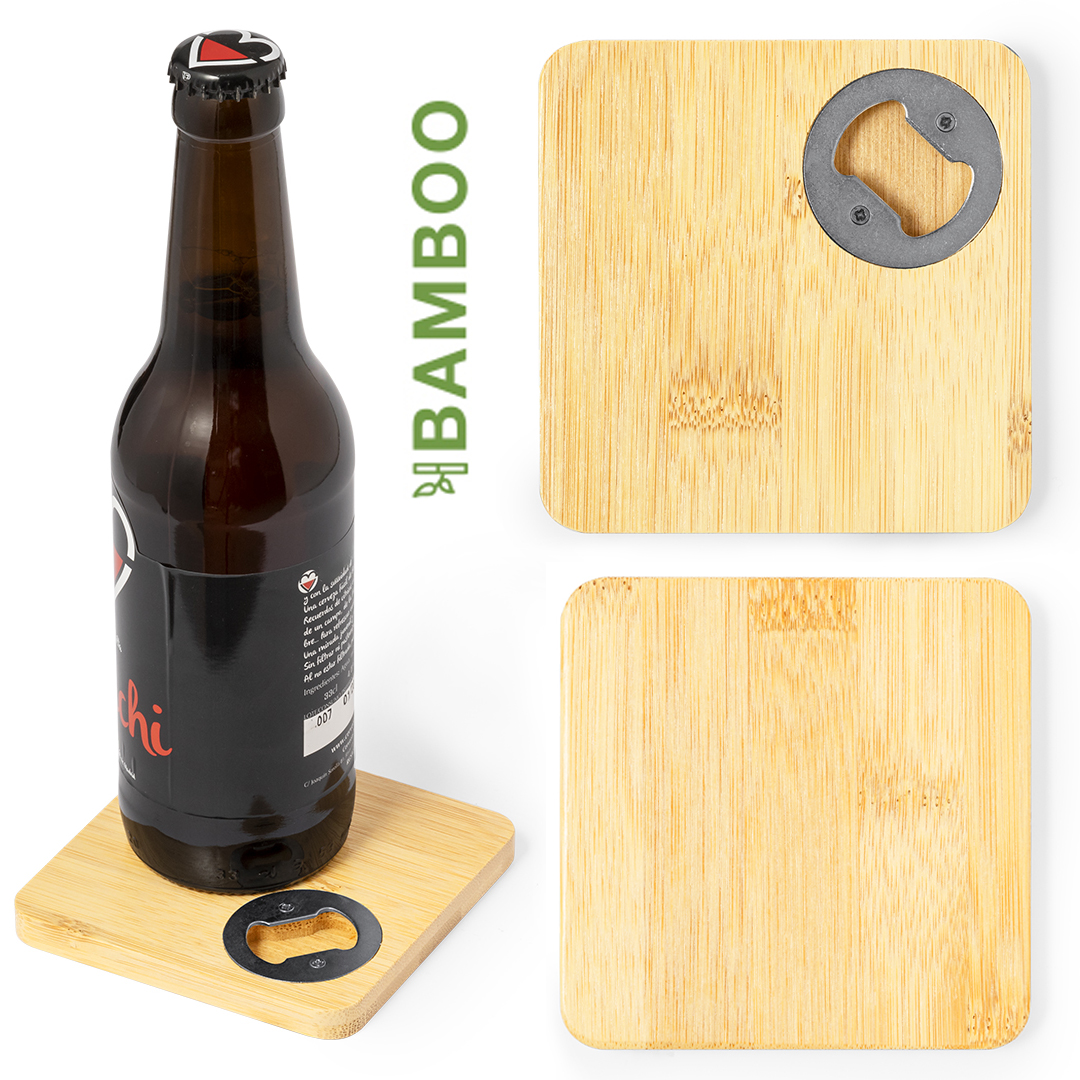 Práctico posavasos fabricado en bambú con abridor integrado, ideal para disfrutar de bebidas protegiendo la superficie y con el abrebotellas incorporado siendo un complemento versátil. Presentado individualmente en caja de diseño kraft.