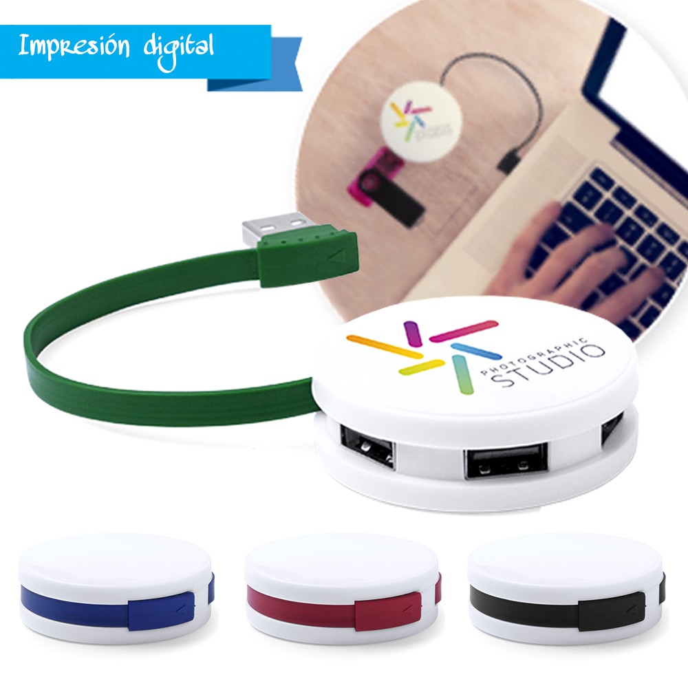 Original y compacto puerto USB de forma redondeada y en diseño bicolor. Incorpora 4 puertos USB 2.0 para conectar multitud de dispositivos y está especialmente diseñado para marcaje en tampografía o digital. Presentado en caja individual. 4 Puertos. USB 2.0