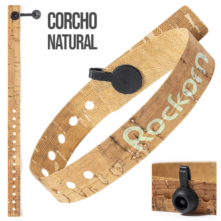 Pulsera para eventos de línea nature. Fabricada en 100% corcho, para así fomentar el uso de materiales naturales y contribuir a la sostenibilidad del planeta. Resistente al agua, ajustable y con cierre de seguridad. Ajustable. Cierre Seguridad