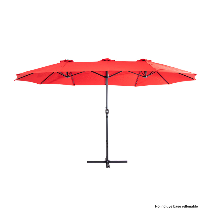 Quitasol ovalado doble de 4.55 x 2.7 m, modelo "Twins", con 12 cascos de lona Poliéster UV impermeable de 180g. Contiene varas reforzadas de Acero recubierto de 12 x 18mm, asta de Acero recubierto de 48mm, sistema de apertura automático con manivela.