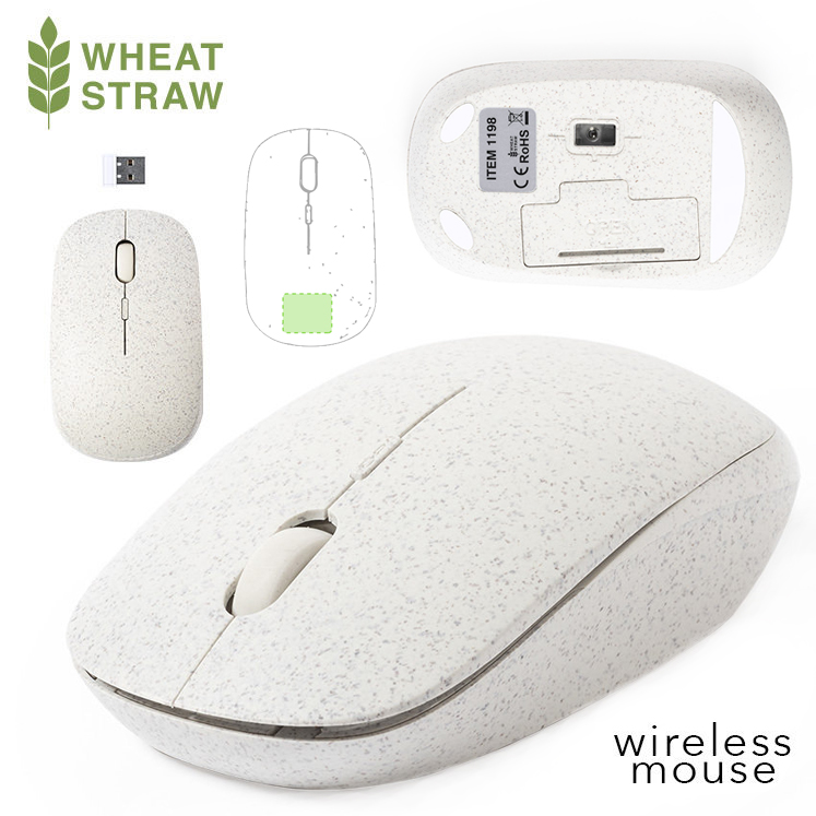 Ratón óptico inalámbrico de línea nature y con diseño ergonómico. Fabricado en caña de trigo, para así fomentar la utilización de materias primas naturales y reducir las emisiones contaminantes. Botón DPI incluido. Alimentación a pilas: 1xAA no incluida. Presentado en atractiva caja de diseño eco. Inalámbrico. Óptico. Botón DPI. 1 Pila AA No Incluida
