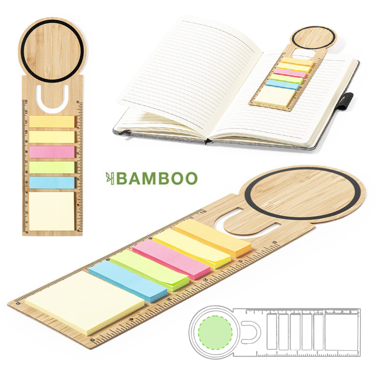 Regla marcapáginas de línea nature. En bambú y con amplia superficie de marcaje. Incluye 25 notas adhesivas medianas y 125 mini notas adhesivas. Sistema métrico en centímetros y pulgadas. 13 cm y 5"". 25 Notas Adhesivas 4 x 4,5 cm. 125 Mininotas Adhesivas 1,2 x 4,5 cm