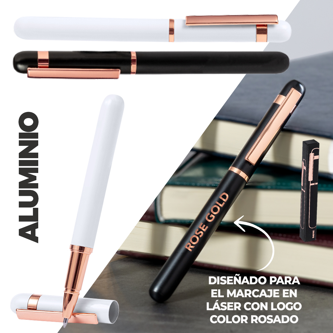 Elegante roller especialmente diseñado para el marcaje en láser con logotipo en color rosado. Con clip metálico y detalles plásticos en acabado rosado. Con cartucho jumbo, en tinta azul y cierre con capucha. Disponible en dos distintivos colores.Presentado en elegante caja de diseño negra. Carga Jumbo