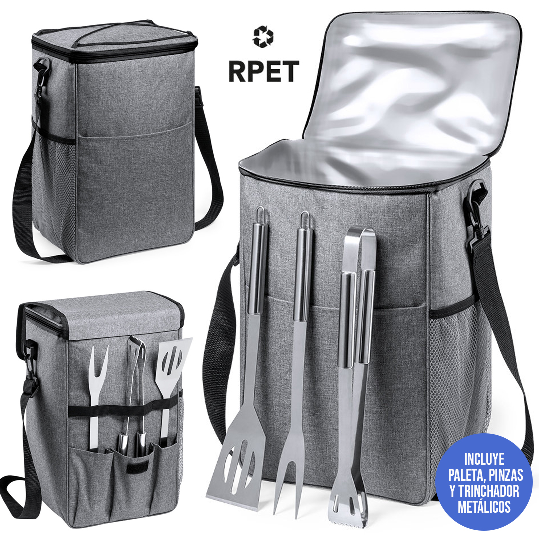 Set de barbacoa con 3 accesorios. Incluye: Bolsa de transporte/nevera fabricada en resistente poliéster RPET 300D, elaborado a partir de plástico reciclado, para así fomentar la reutilización de residuos plásticos y ayudar a la sostenibilidad del planeta. Con cinta para hombro ajustable de cierre de mosquetón e interior isotermo en PEVA, para conservar la temperatura de los alimentos. Distintivo RPET en etiqueta etiqueta exterior. Paleta, pinzas y trinchador metálicos, con mangos en color negro. 3 Accesorios
