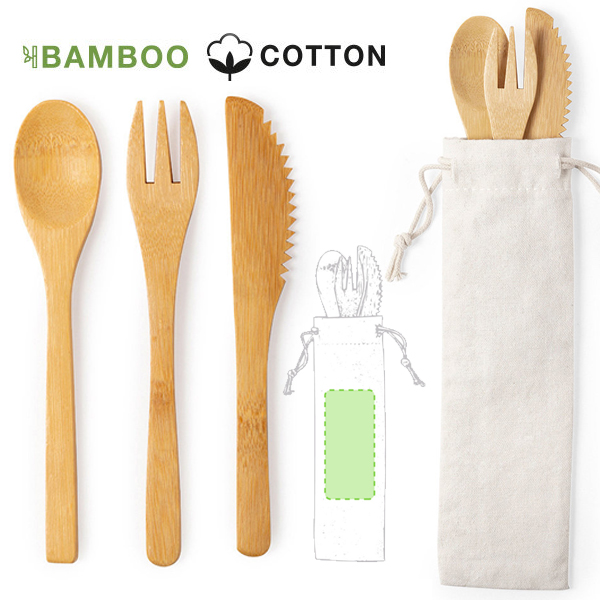 Set de 3 cubiertos de línea nature. Fabricados en bambú, incluye tenedor, cuchara y cuchillo. Presentados en funda de algodón con cordón auto cierre. 3 Piezas. Funda Algodón