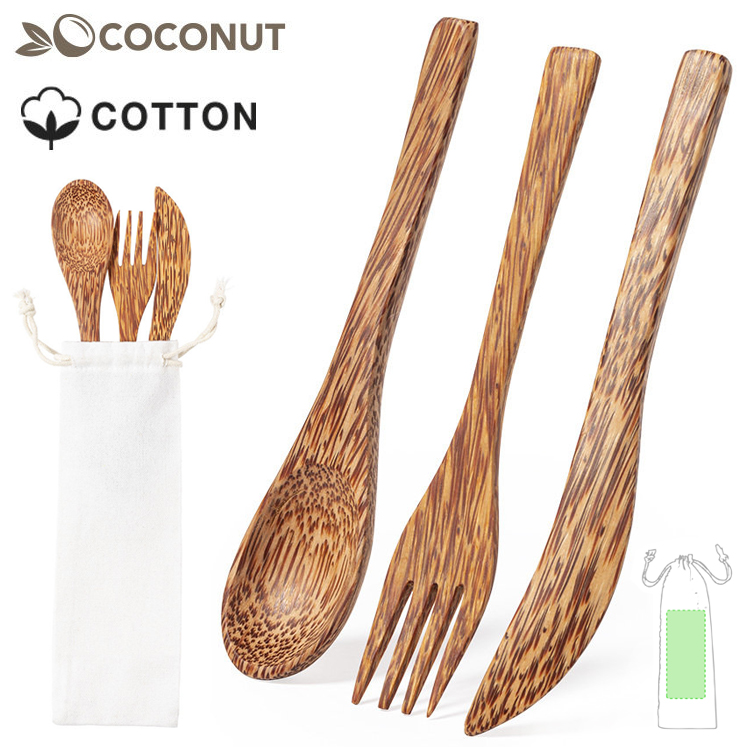 Set de cubiertos reutilizables de línea nature fabricados en coco. Tras el consumo de su fruto, del coco y su planta se pueden obtener multitud de productos, contribuyendo a la sostenibilidad del planeta y fomentando el uso de materias primas naturales. Incluye cuchara, cuchillo y tenedor. Presentados en bolsita individual de algodón con cierre de cordón. 3 Piezas. Funda Algodón