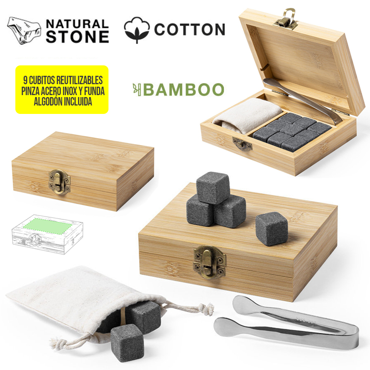 Set de 9 cubitos reutilizables. Fabricados en piedra natural esteatita, también conocida como piedra o roca de jabón, que mantiene la bebida fría sin alterar sus propiedades al no diluir su contenido en agua, además de mantener el sabor original de la misma. Incluye pinzas de acero inoxidable y funda de algodón. Presentado en estuche de bambú. Reutilizable. 9 Piezas. Pinza Acero Inox y Funda Algodón
