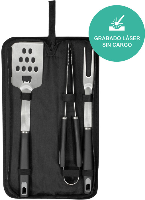 46,5 x 12 x 4,5 cm cerrado. Acero inoxidable y polipropileno + Poliéster. Set de asado en estuche color negro con cierre. Contiene 3 utensilios de acero inoxidable 420: tenedor de 135g y 41 cm de largo; pinza de 275g y 39 cm de largo; y espátula de 225g y 43 cm de largo, todos con mango de polipropileno en color negro. Espátula multipropósito (recoge, escurre, corta y destapa). Calidad premium. Estuche con cierre.