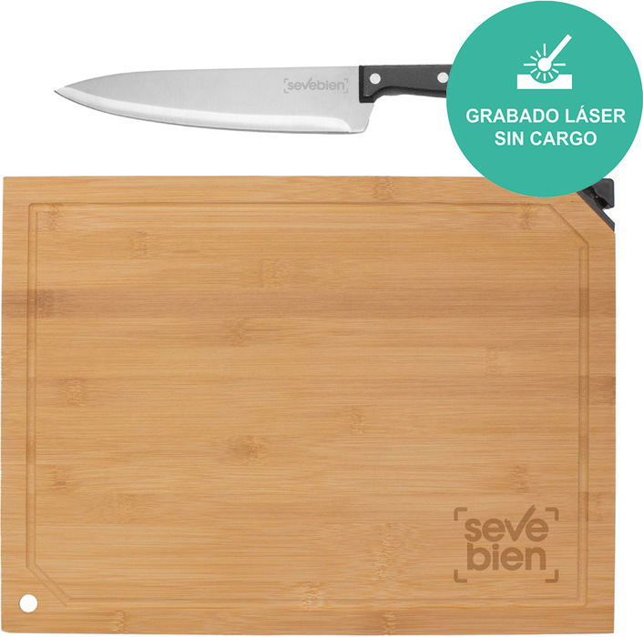 40 x 30 x 1.2 cm. Bambú. Set de corte. Tabla de Bambú con afilador incorporado y cuchillo. Cuchillo de acero inoxidable con mango en madera color negro de 32.5 cm . Afilador de plástico y acero de 5 x 2,4 x 1,2 cm. Presentación en caja de regalo.